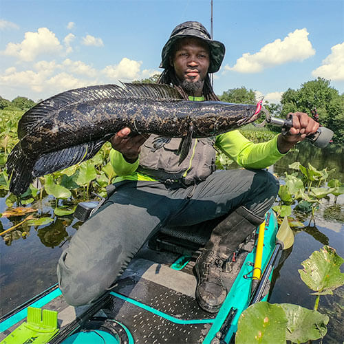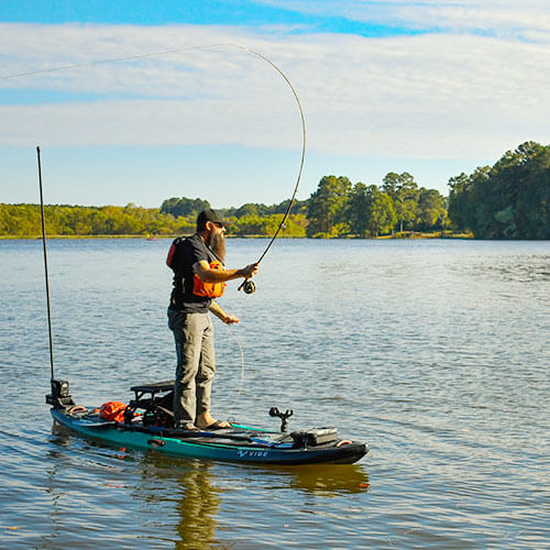 This hybrid fishing kayak features a huge open deck platform with tie-down points for adding cargo or rigging accessories, while still providing plenty of available cargo room.