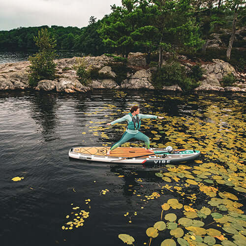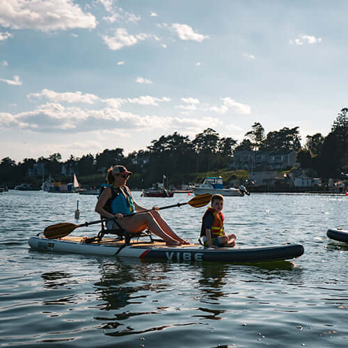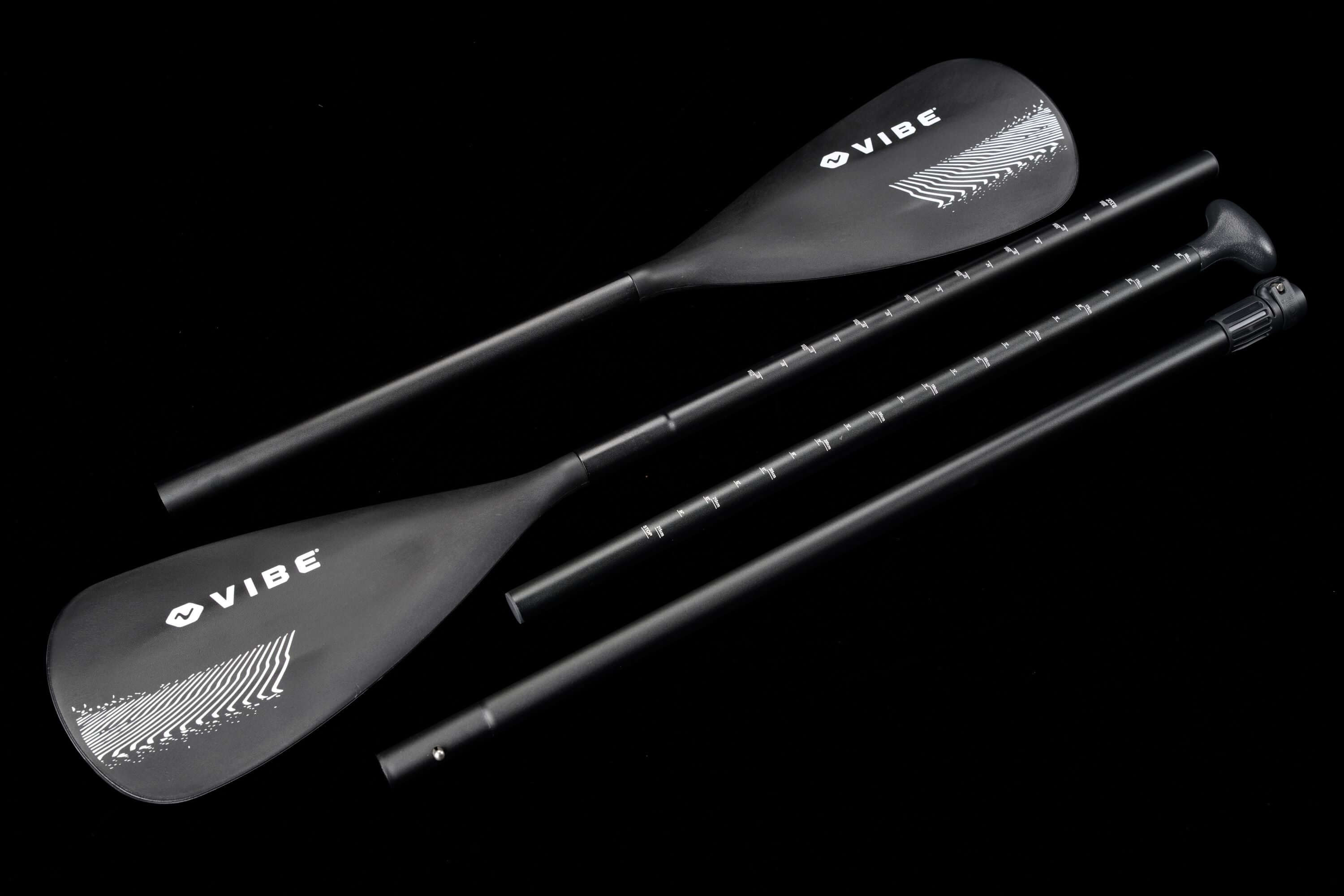 The Vibe Roamer Hybrid gives the paddler the option between a SUP T-handle for stand paddling and a dual-blade coupler for seated kayak-style paddle adventures.